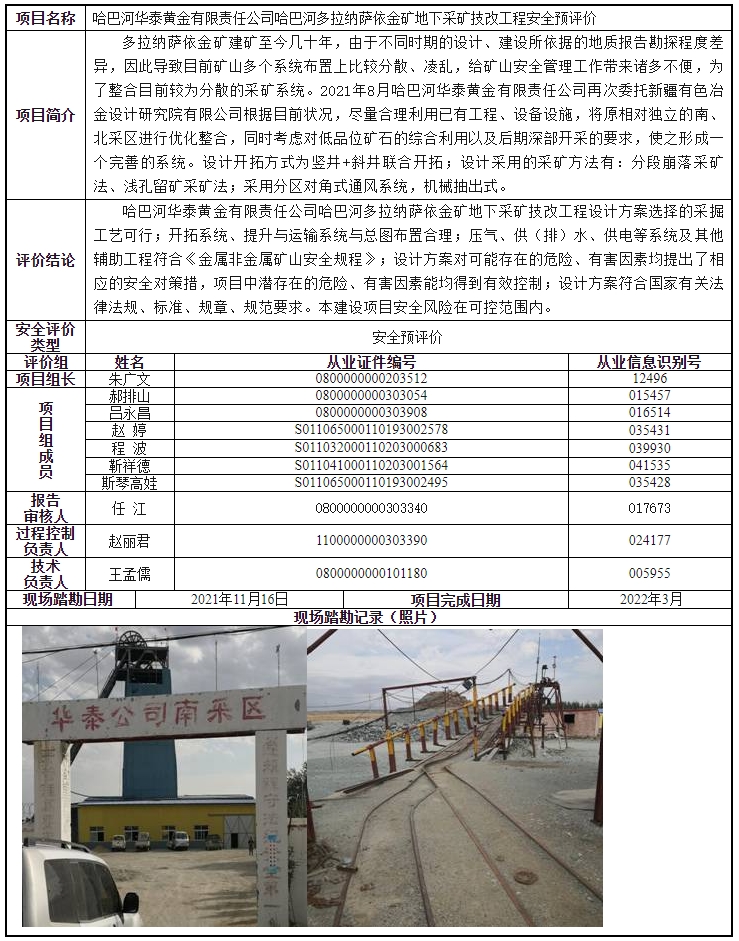 哈巴河华泰黄金有限责任公司哈巴河多拉纳萨依金矿地下采矿技改工程安全预评价
