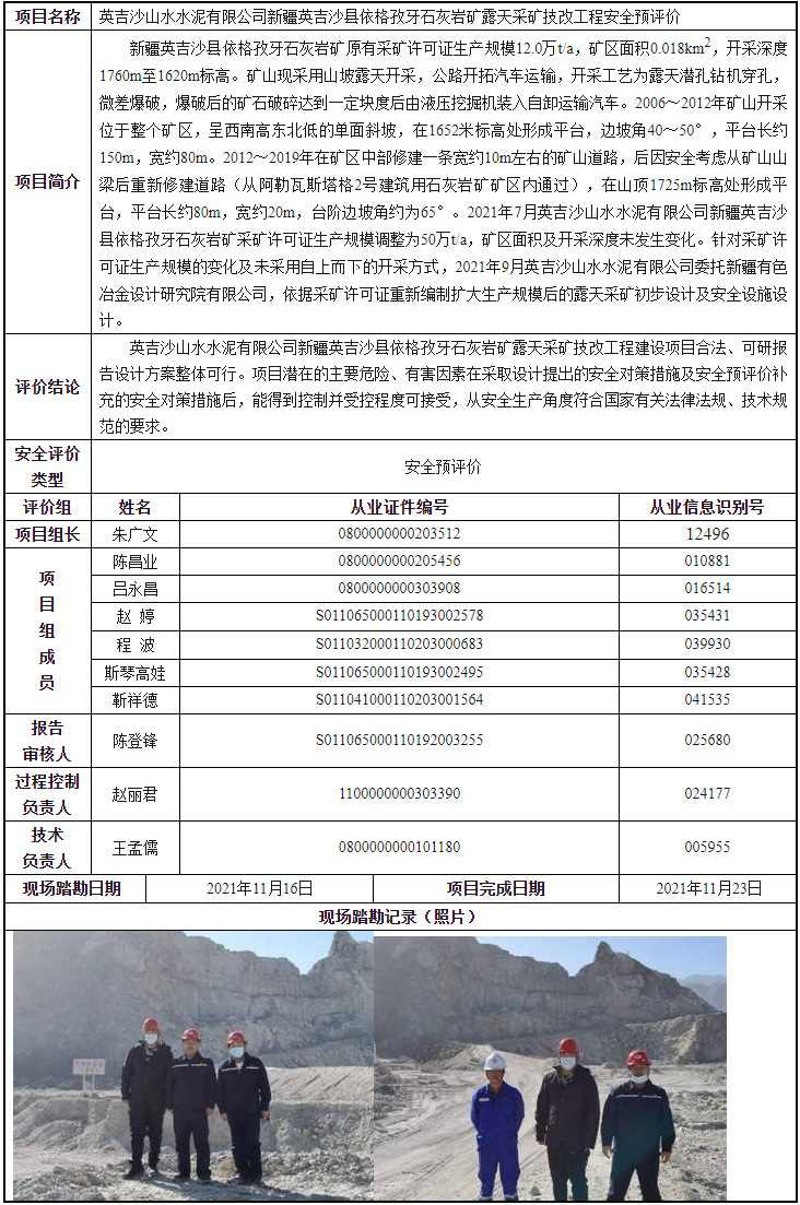 英吉沙山水水泥有限公司新疆英吉沙县依格孜牙石灰岩矿露天采矿技改工程安全预评价