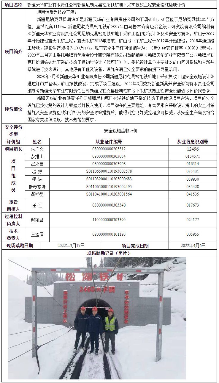 新疆天华矿业有限责任公司新疆尼勒克县松湖铁矿地下采矿技改工程安全设施验收评价