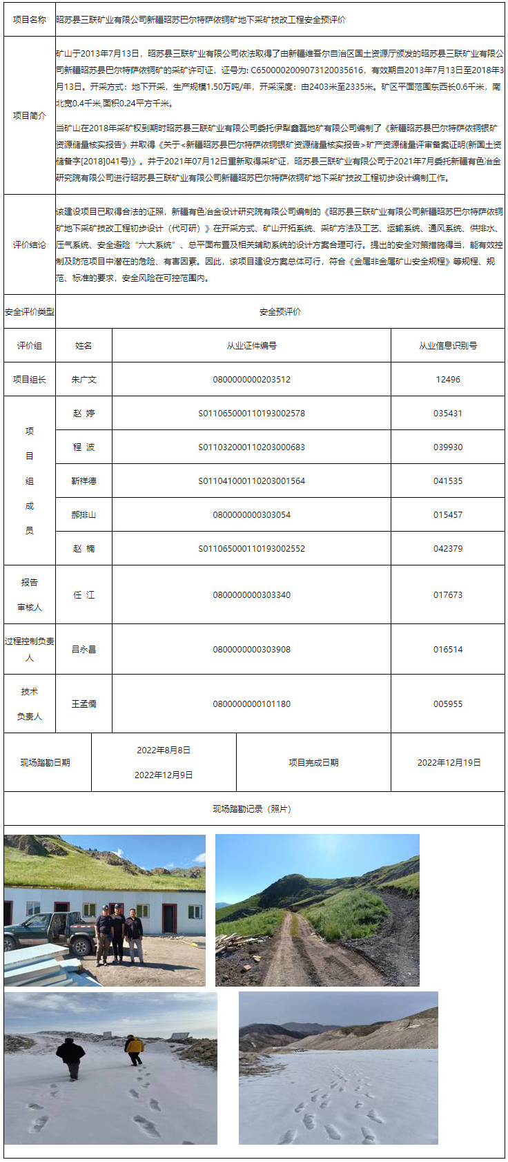 昭苏县三联矿业有限公司新疆昭苏巴尔特萨依铜矿地下采矿技改工程安全预评价