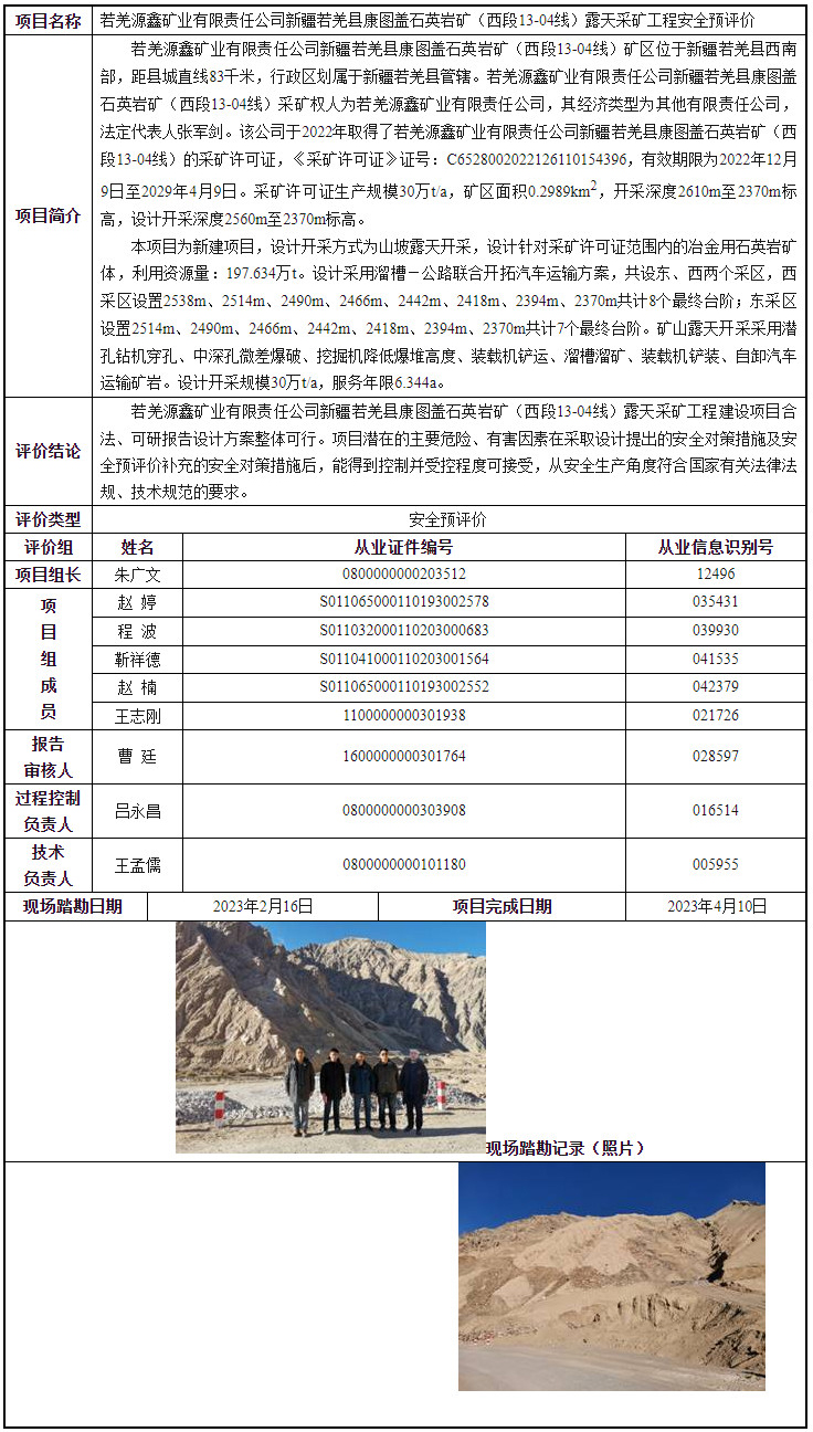 若羌源鑫矿业有限责任公司新疆若羌县康图盖石英岩矿(西段13-04线)露天采矿工程安全预评价
