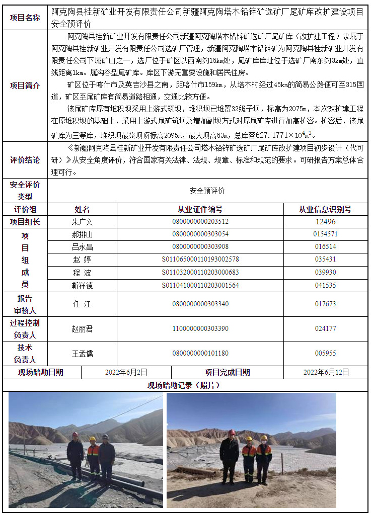阿克陶县桂新矿业开发有限责任公司新疆阿克陶塔木铅锌矿选矿厂尾矿库改扩建设项目