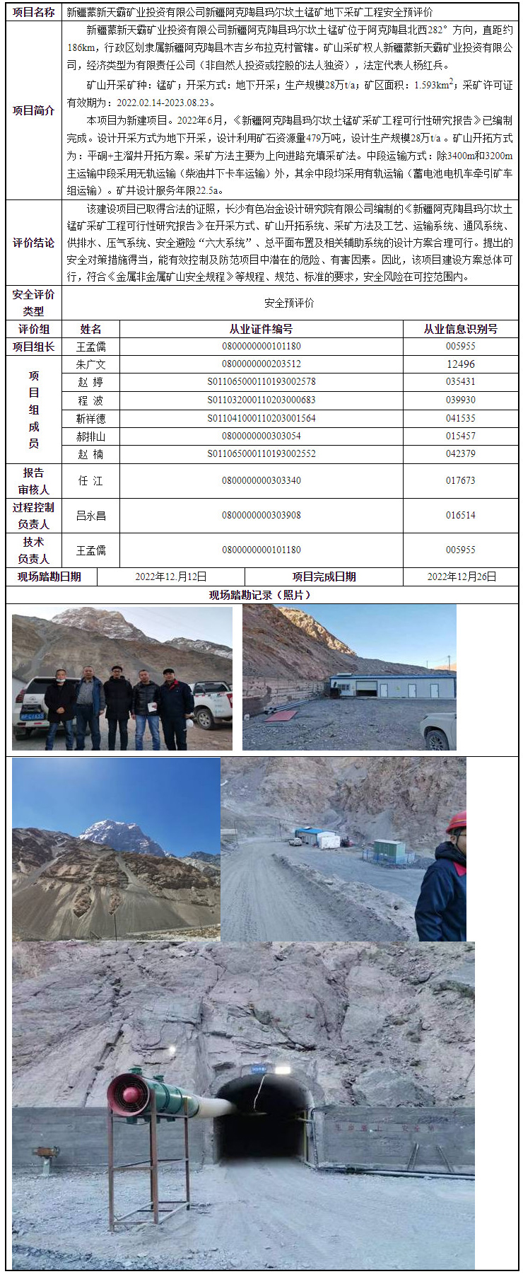 新疆蒙新天霸矿业投资有限公司新疆阿克陶县玛尔坎土锰矿地下采矿工程安全预评价