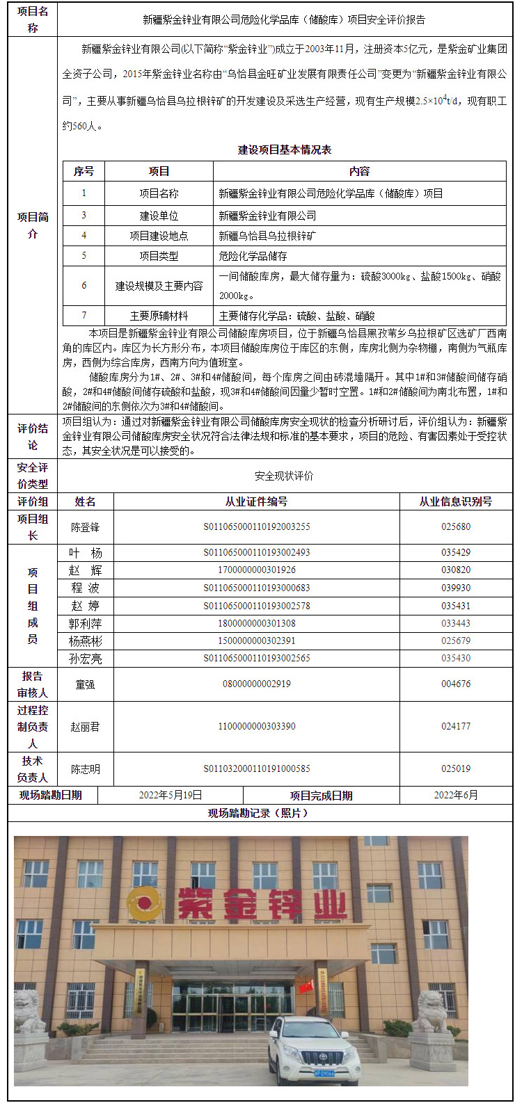 新疆紫金锌业有限公司危险化学品库(储酸库)项目安全评价报告