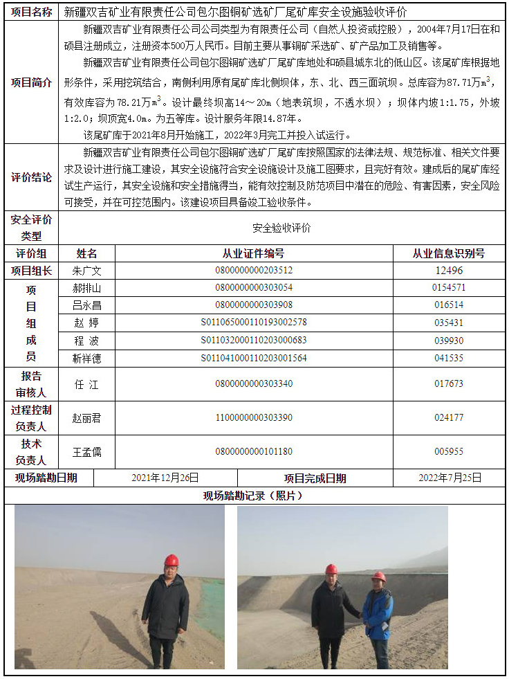 新疆双吉矿业有限责任公司包尔图铜矿选矿厂尾矿库安全设施验收评价