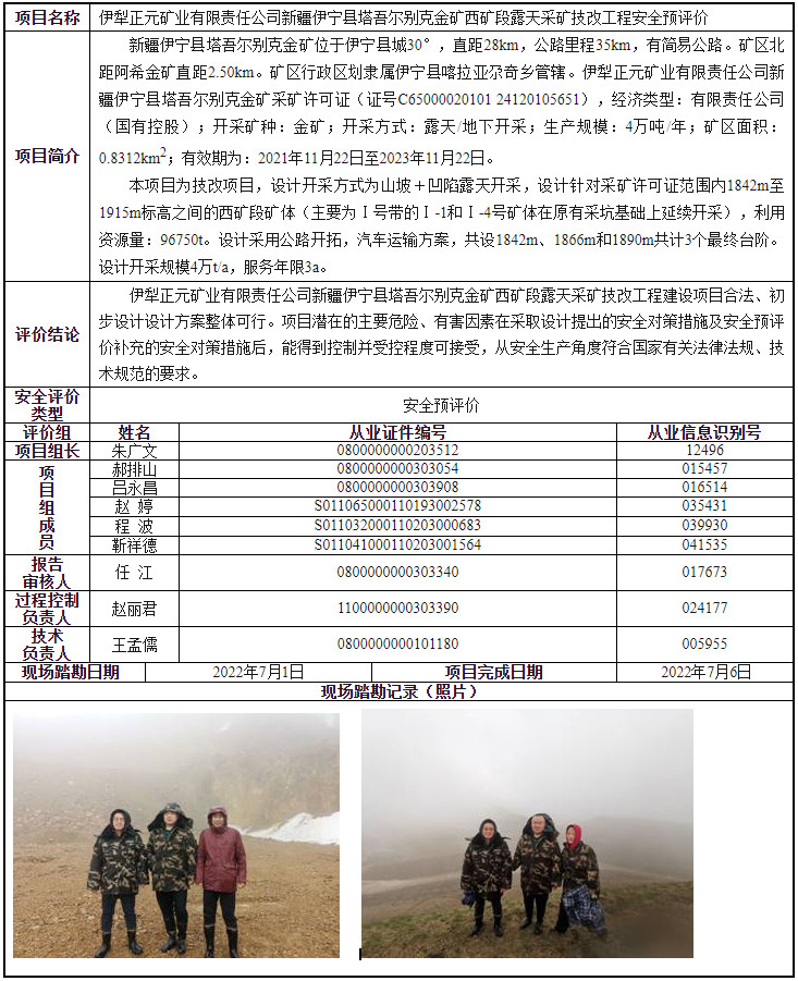 伊犁正元矿业有限责任公司新疆伊宁县塔吾尔别克金矿西矿段露天采矿技改工程安全预评价 2022-07-19 17:27:20