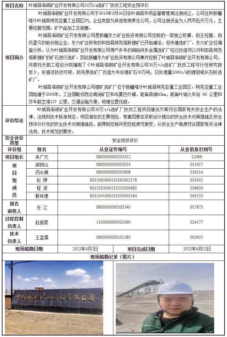叶城县临钢矿业开发有限公司30万t/a选矿厂技改工程安全预评价