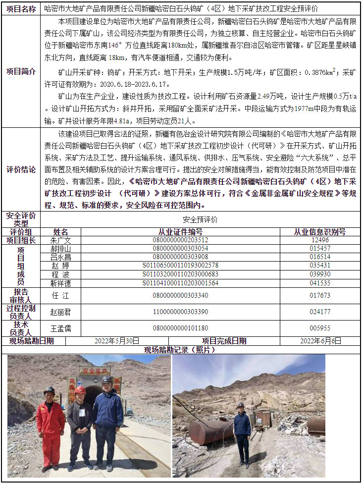 哈密市大地矿产品有限责任公司新疆哈密白石头钨矿(4区)地下采矿技改工程安全预评价 2022-07-01 17:34:55