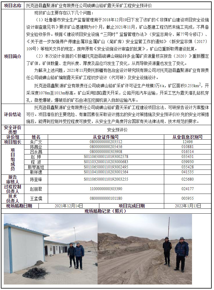托克逊县鑫聚源矿业有限责任公司硫磺山铅矿露天采矿工程安全预评价