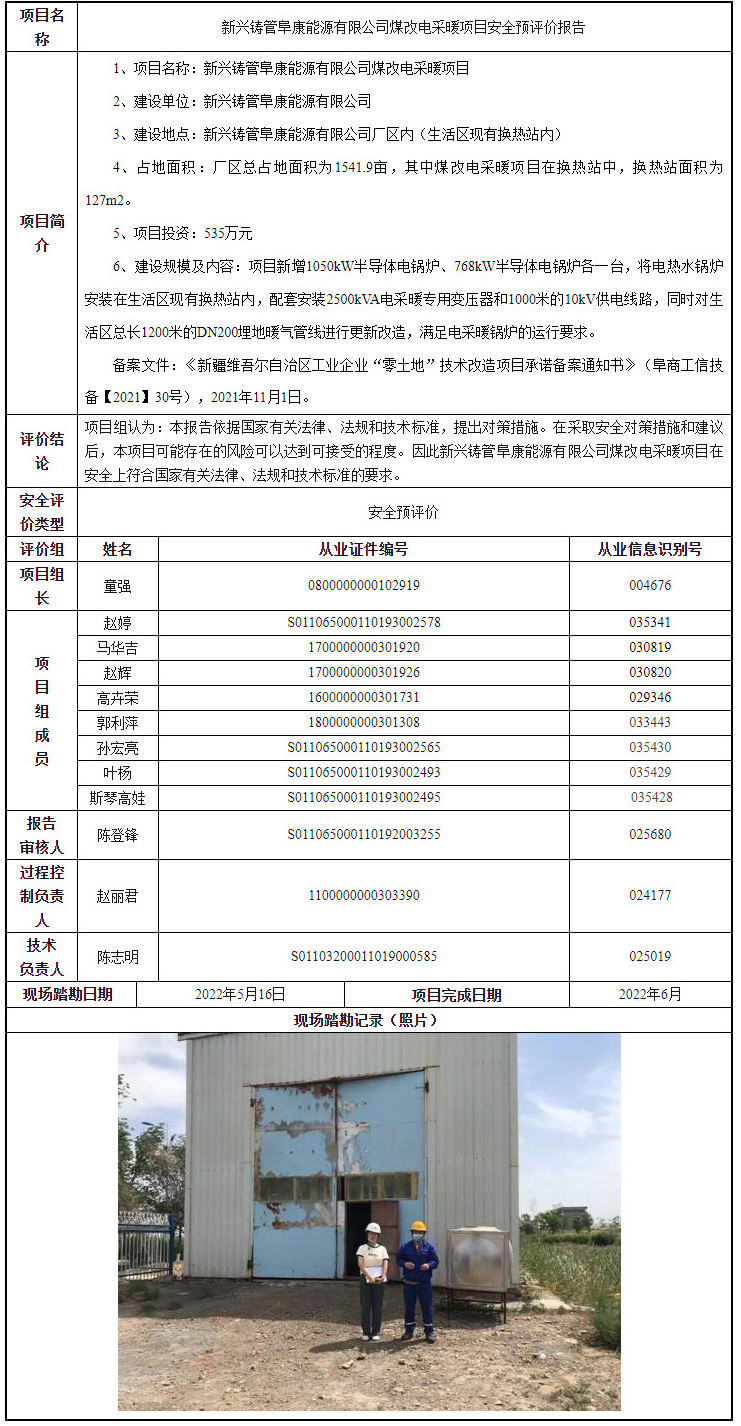 新兴铸管阜康能源有限公司煤改电采暖项目安全预评价报告