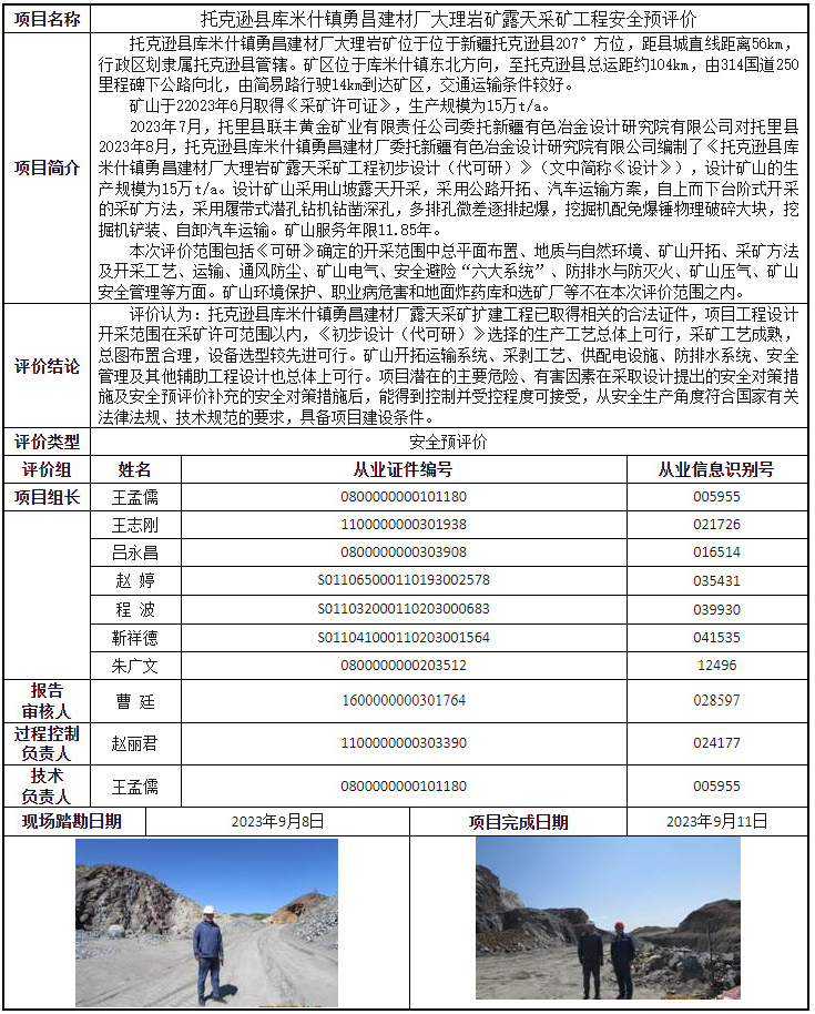 托克逊县库米什镇勇昌建材厂大理岩矿露天采矿工程安全预评价