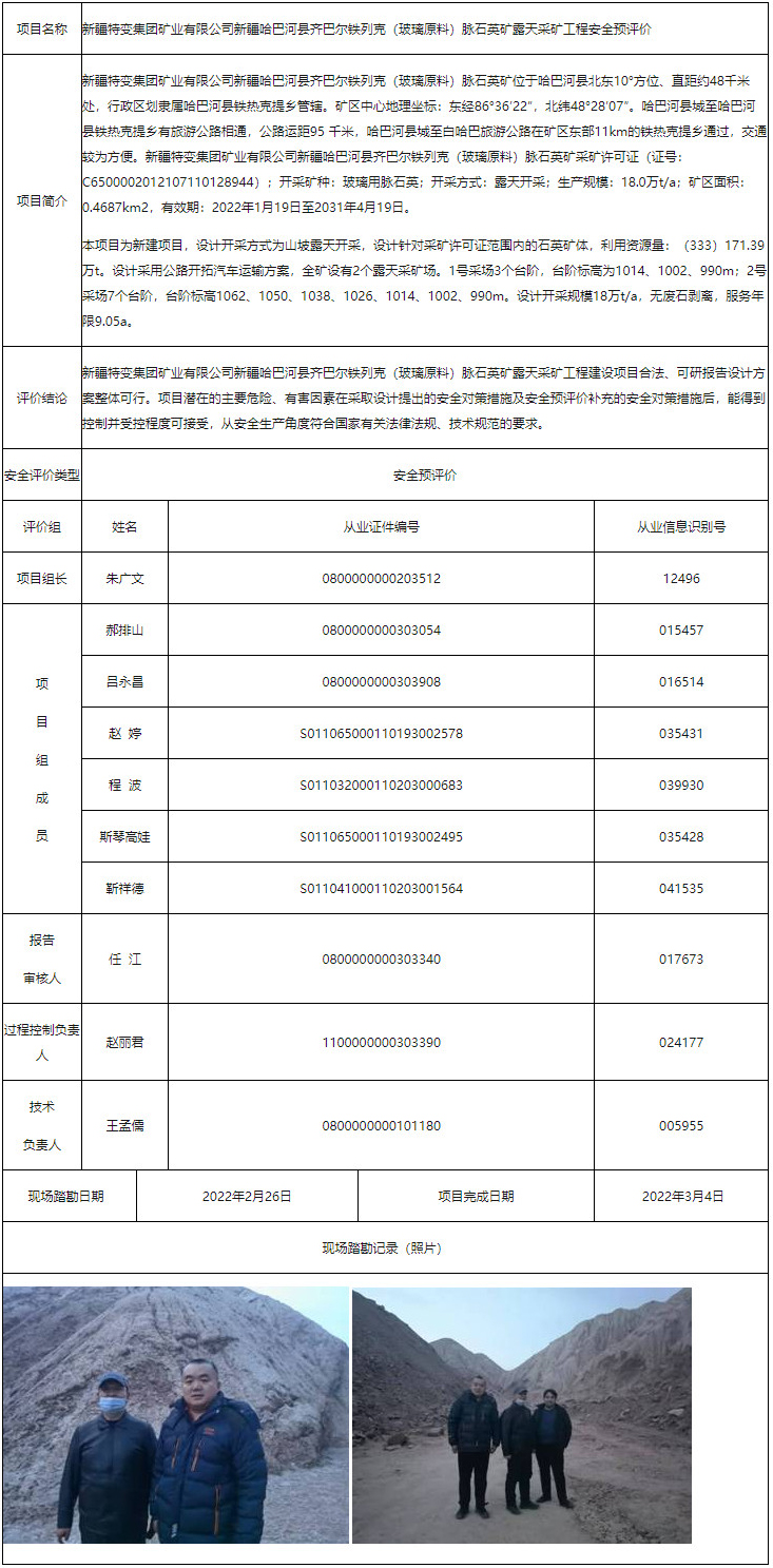 新疆特变集团矿业有限公司新疆哈巴河县齐巴尔铁列克(玻璃原料)脉石英矿露天采矿工程安全预评价 2022-06-17 16:40:52