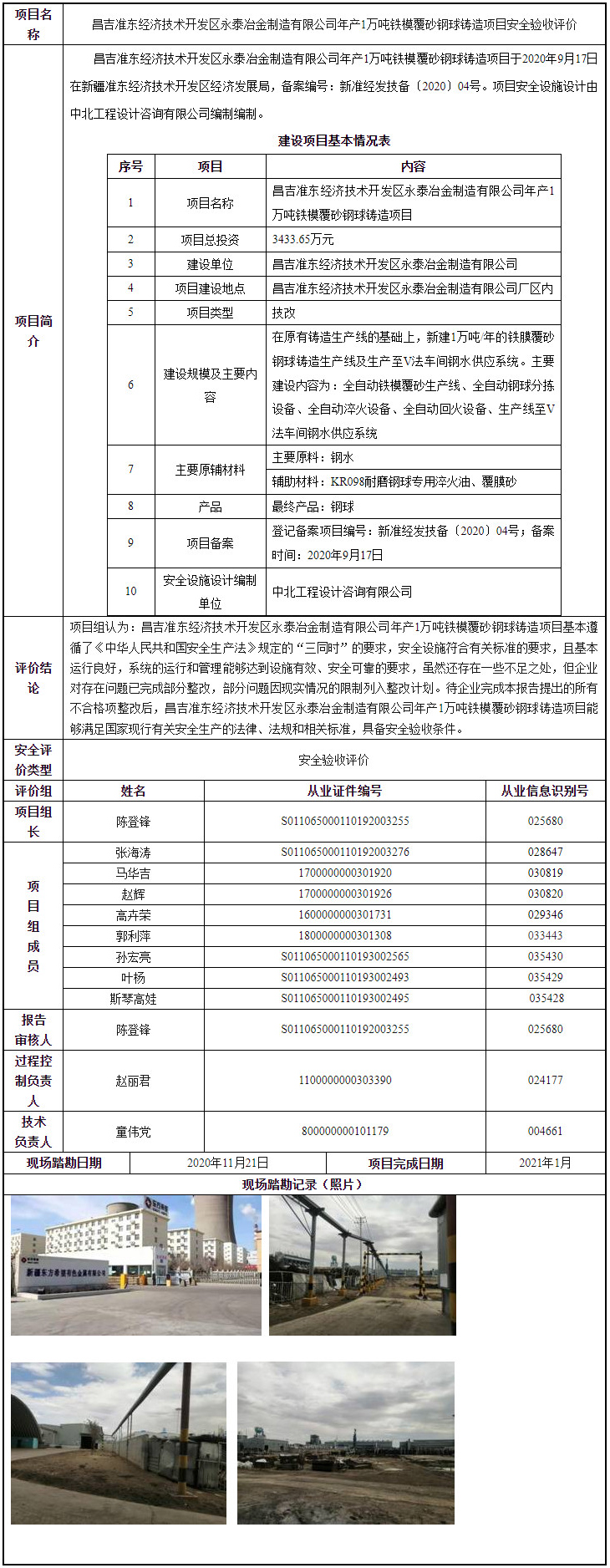 昌吉准东经济技术开发区永泰冶金制造有限公司年产1万吨铁模覆砂钢球铸造项目安全验收评价 2021-07-02 17:01:02
