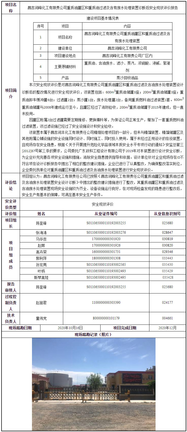昌吉润峰化工有限责公司重质油罐区和重质油过滤及含有废水处理装置诊断后安全现状评价报告