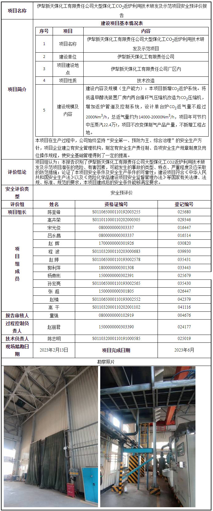 伊犁新天煤化工有限责任公司大型煤化工CO2返炉利用技术研发及示范项目安全预评价