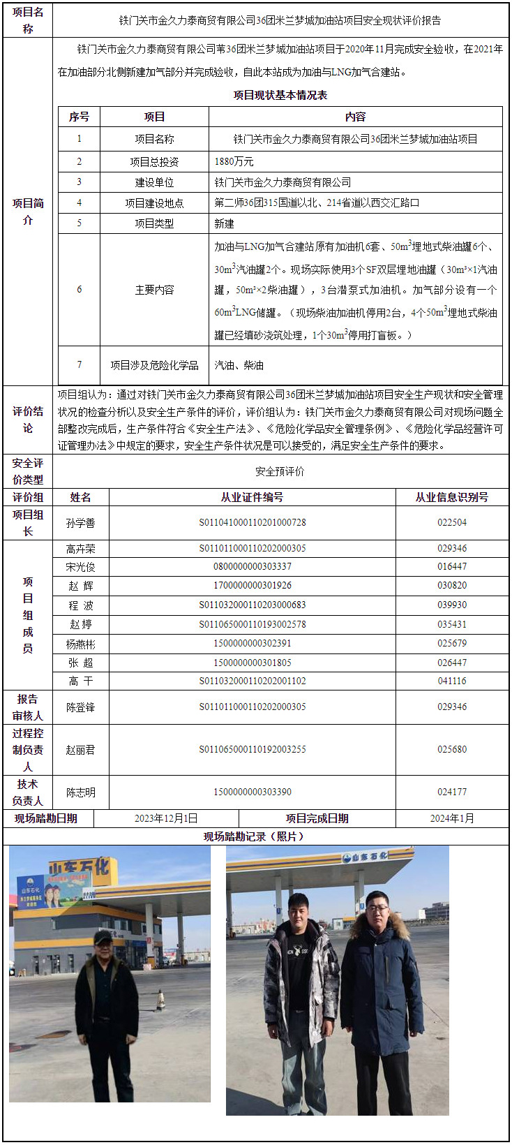 铁门关市金久力泰商贸有限公司36团米兰梦城加油站项目安全现状评价报告