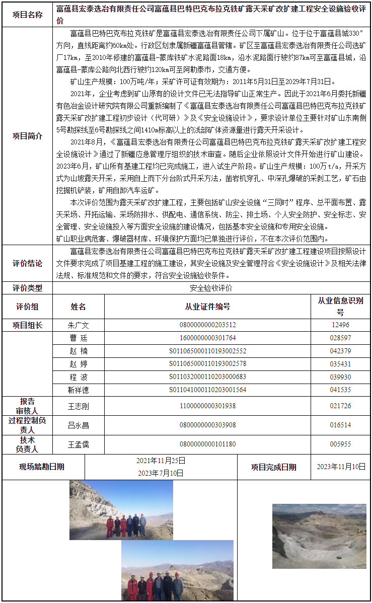 富蕴县宏泰选冶有限责任公司富蕴县巴特巴克布拉克铁矿露天采矿改扩建工程安全设施验收评价