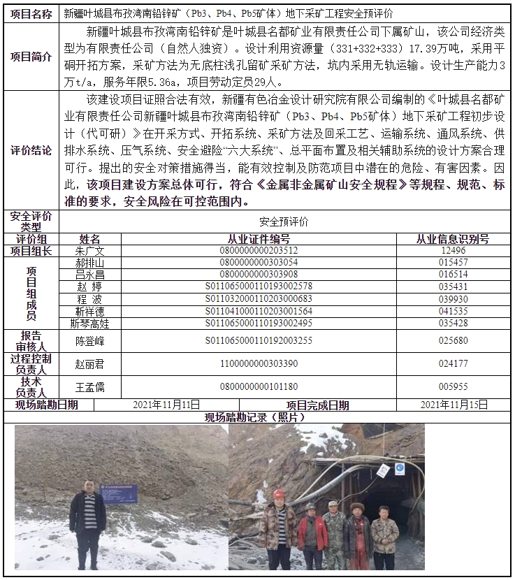新疆叶城县布孜湾南铅锌矿(Pb3、Pb4、Pb5矿体)地下采矿工程安全预评价