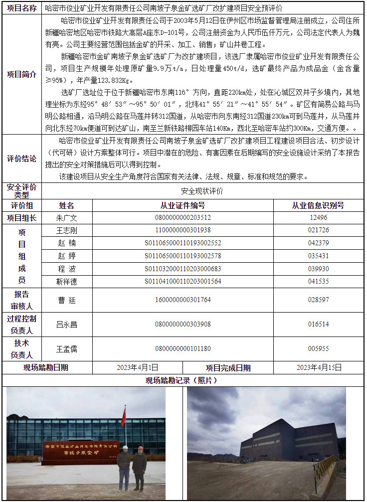 哈密市俊业矿业开发有限责任公司南坡子泉金矿选矿厂改扩建项目安全预评价