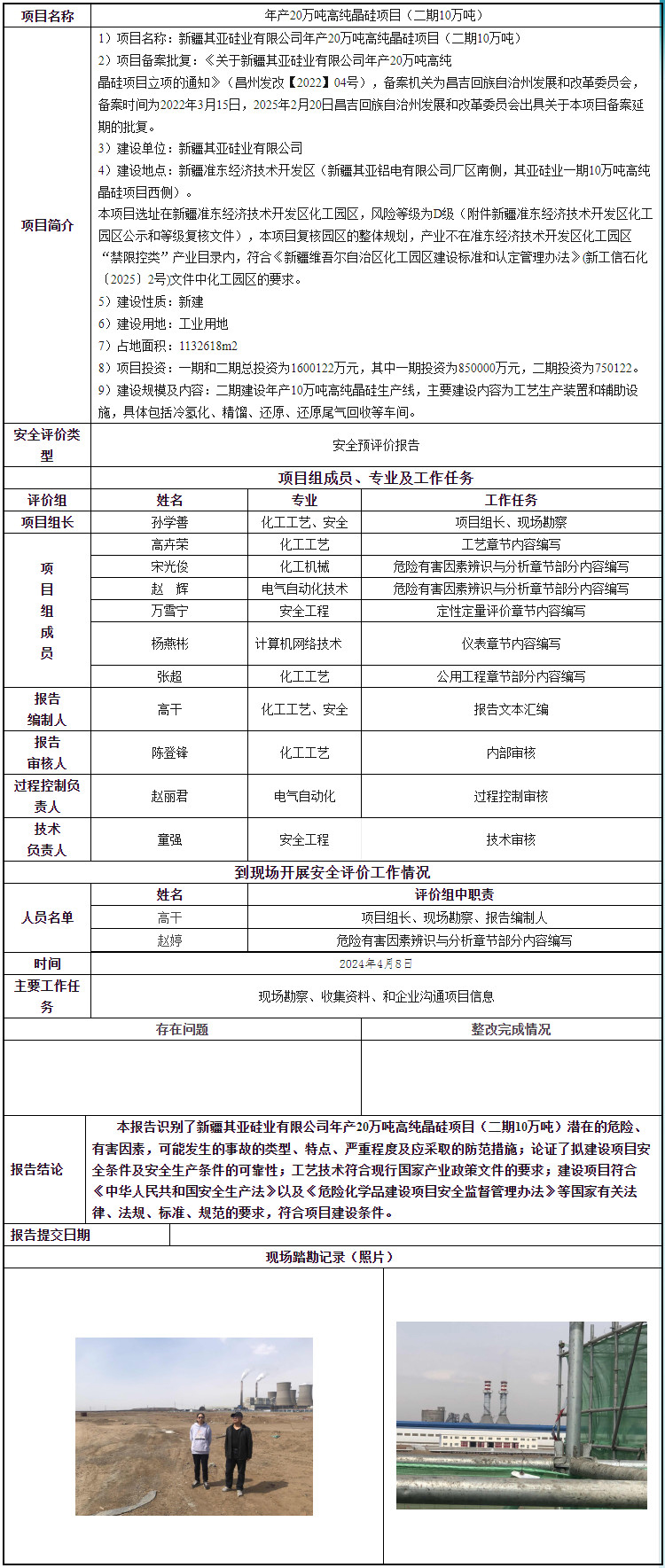 新疆其亚硅业有限公司年产20万吨高纯晶硅项目(一期10万吨)安全预评价
