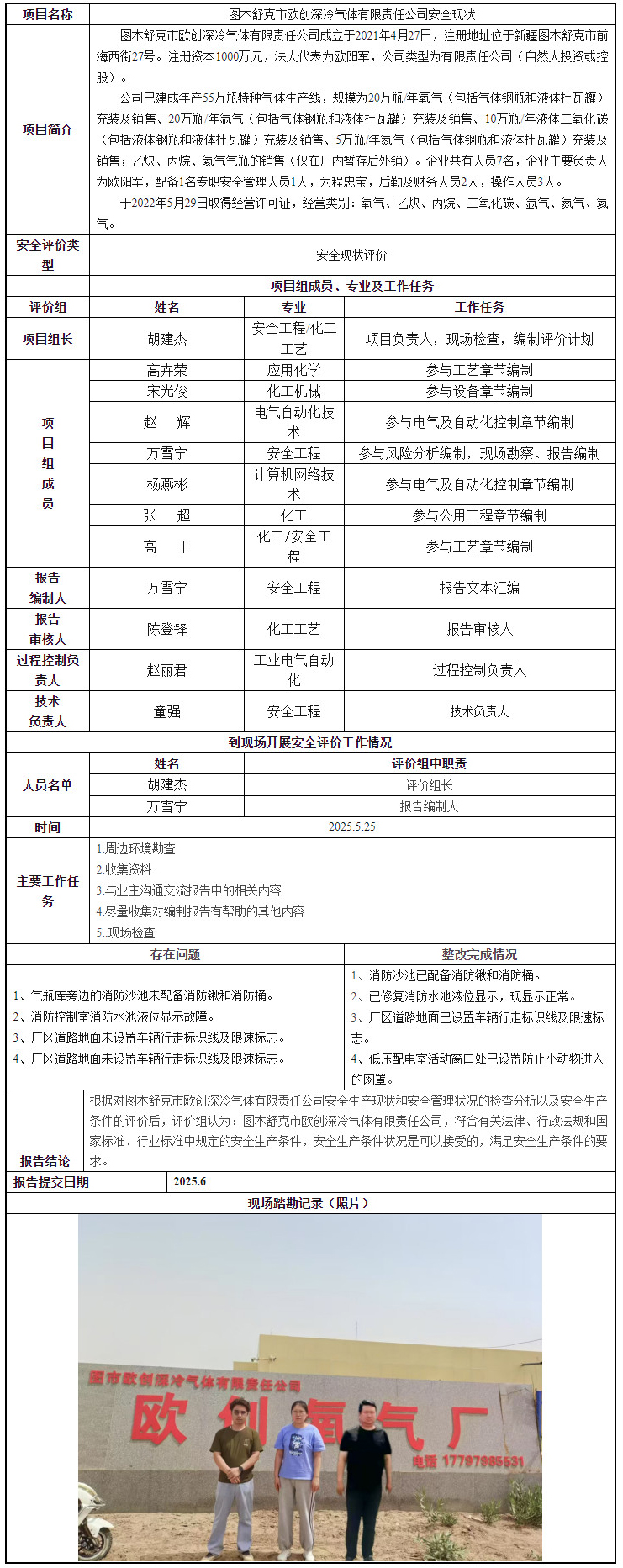 图木舒克市欧创深冷气体有限责任公司年产55万瓶特种气体生产线安全验收评价
