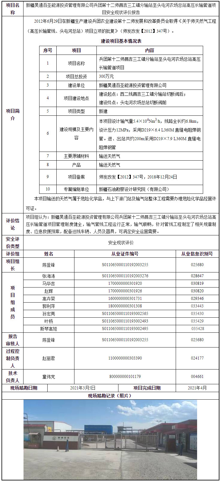 新疆昊通百圣能源投资管理有限公司兵团第十二师昌吉三工镇分输站至头屯河农场总站高压长输管道项目安全现状评价报告