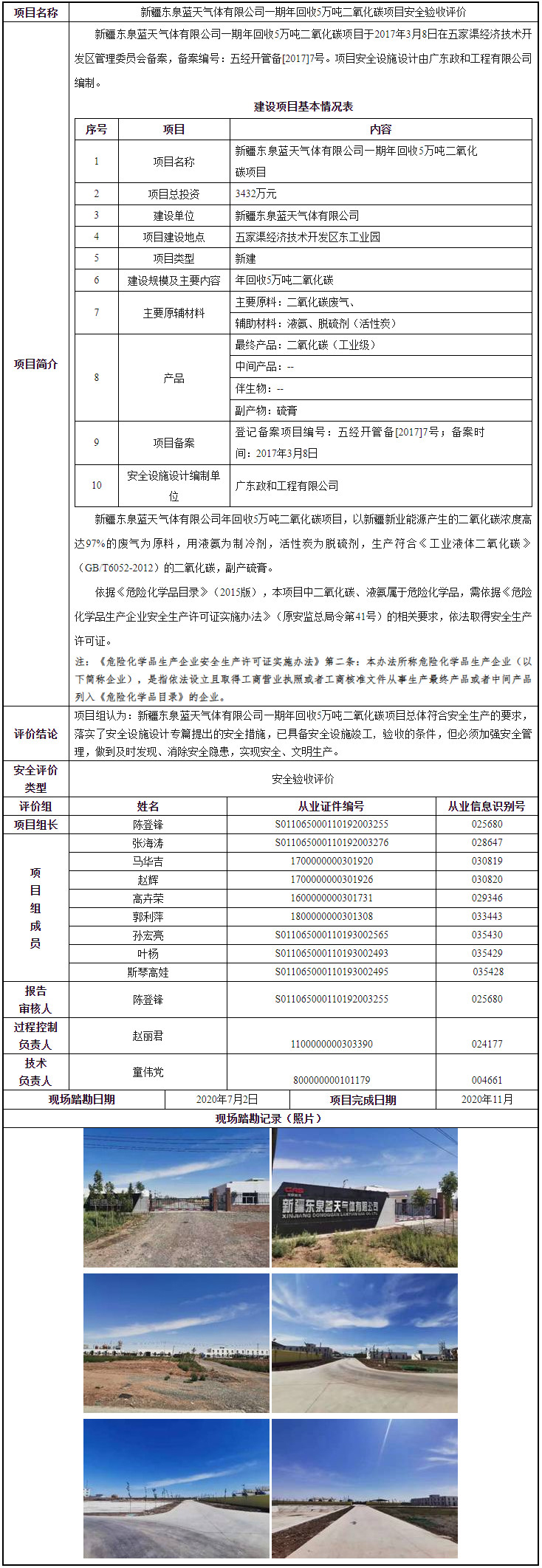 新疆东泉蓝天气体有限公司一期年回收5万吨二氧化碳项目安全验收评价
