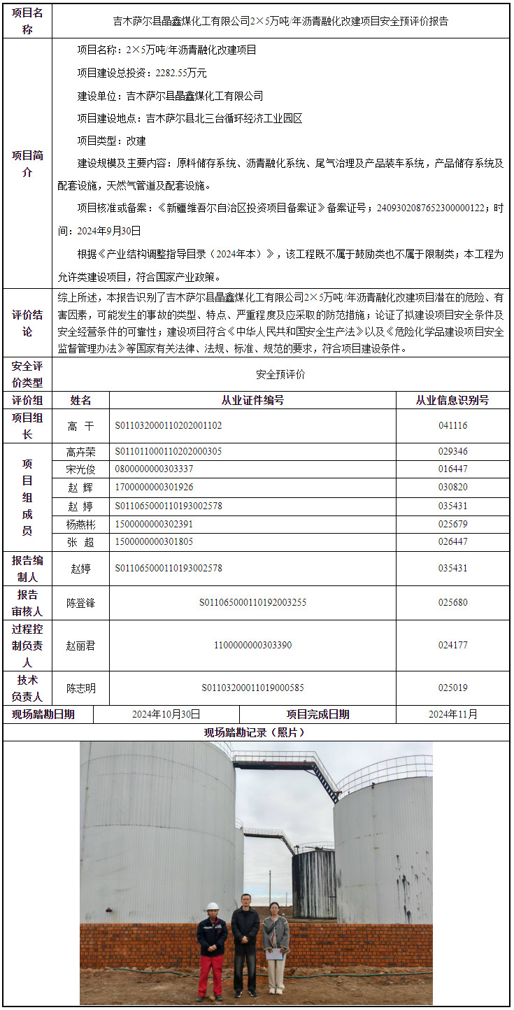 吉木萨尔县晶鑫煤化工有限公司2×5万吨/年沥青融化改建项目安全预评价报告