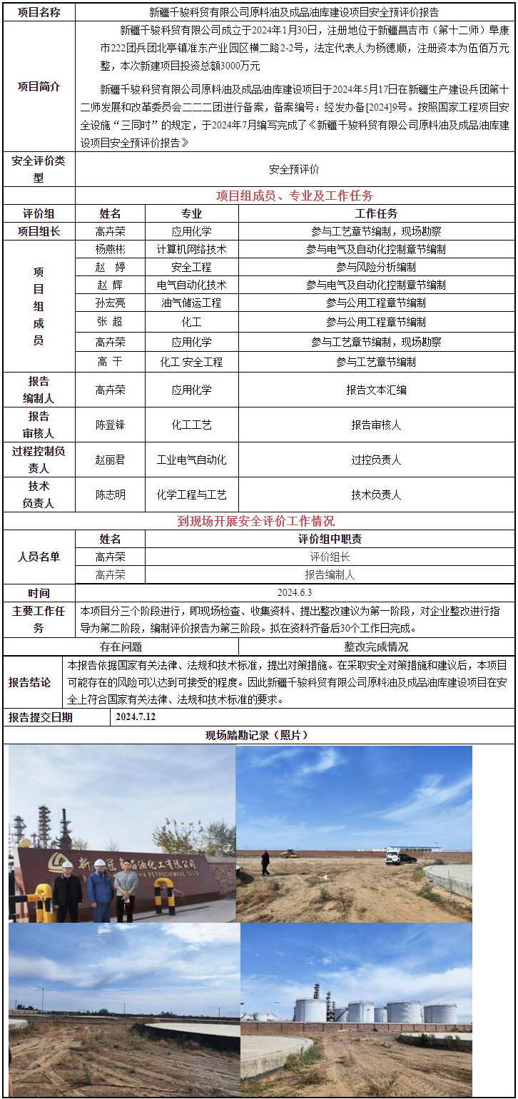 新疆千骏科贸有限公司原料油及成品油库建设项目安全预评价报告