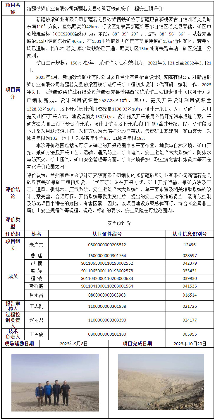 新疆砂梁矿业有限公司新疆若羌县砂梁西铁矿采矿工程安全预评价