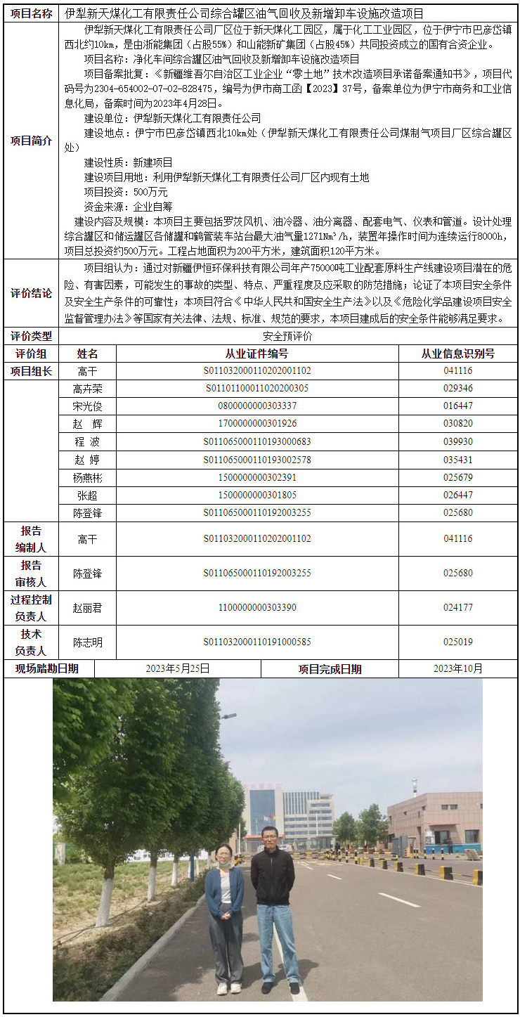 伊犁新天煤化工有限责任公司综合罐区油气回收及新增卸车设施改造项目