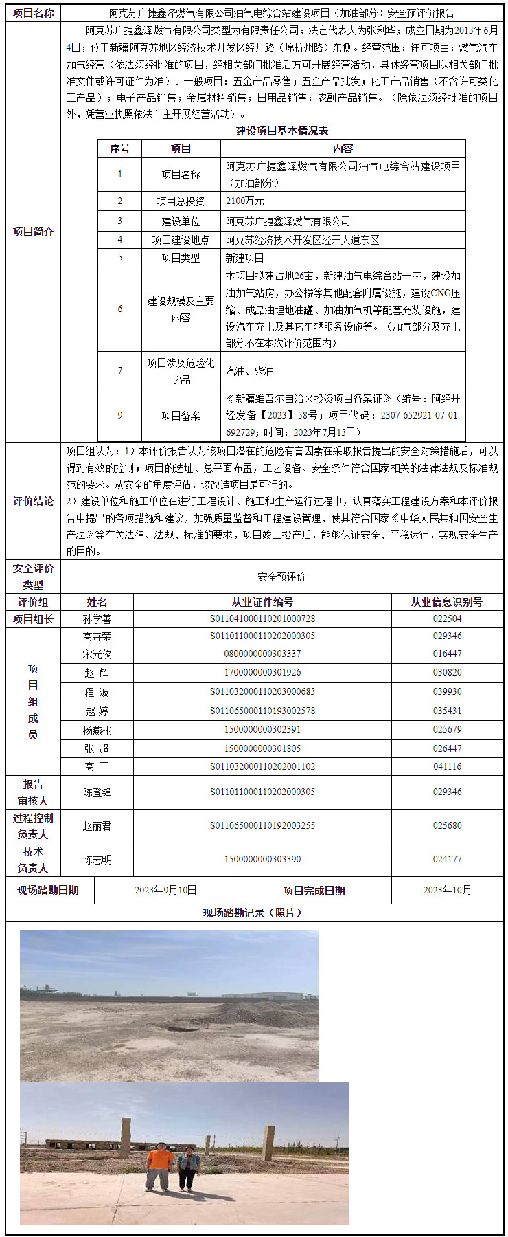 阿克苏广捷鑫泽燃气有限公司油气电综合站建设项目(加油部分)安全预评价报告