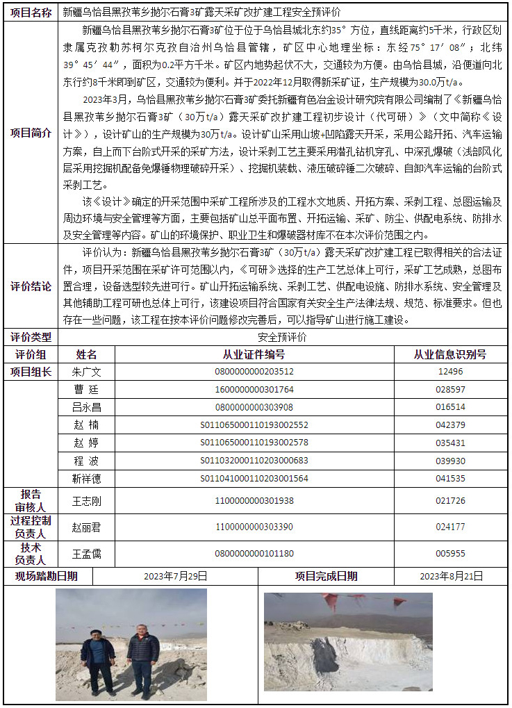 新疆乌恰县黑孜苇乡抛尔石膏3矿露天采矿改扩建工程安全预评价