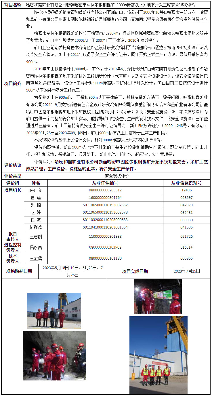 哈密和鑫矿业有限公司新疆哈密市图拉尔根铜镍矿(900M标高以上)地下开采工程安全现状评价 2023-08-03 15:17:08