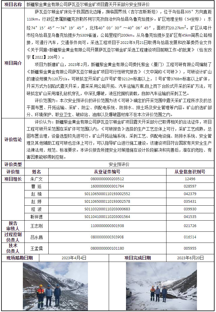 新疆紫金黄金有限公司萨瓦亚尔顿金矿项目露天开采部分安全预评价