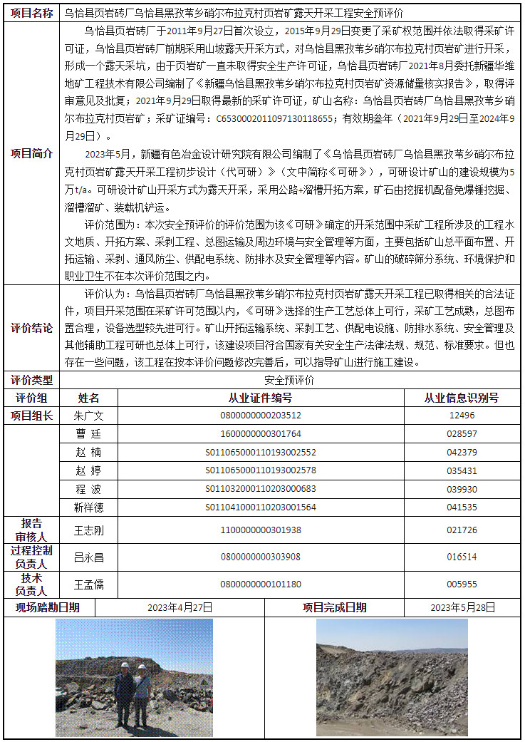 乌恰县页岩砖厂乌恰县黑孜苇乡硝尔布拉克村页岩矿露天开采工程安全预评价